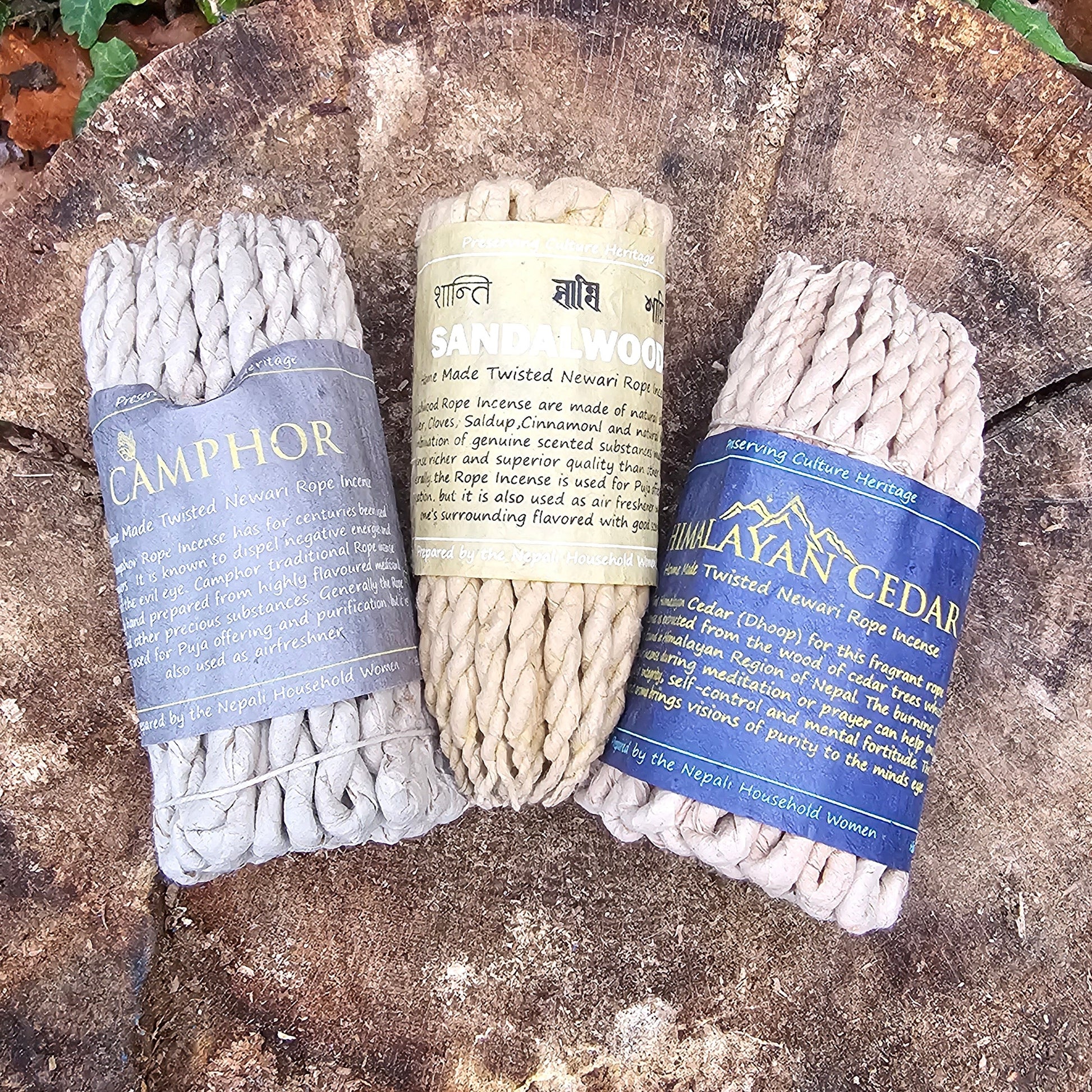 Incense ropes are made by hand in a process that involves bundling the ingredients in a special hand prepared rice paper, then rolling and twisting it into a small rope-like braided form.